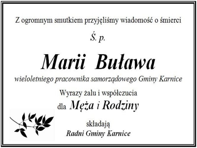 Wyrazy głębokiego współczucia Mężowi oraz Najbliższym ś.p. Marii Buława składają Wójt Gminy Karnice Lech Puzdrowski wraz z pracownikami Urzędu Gminy Kanice, Radni Gminy Karnice oraz Kierownik Ośrodka Pomocy Społecznej w Karnicach wraz z pracownikami.