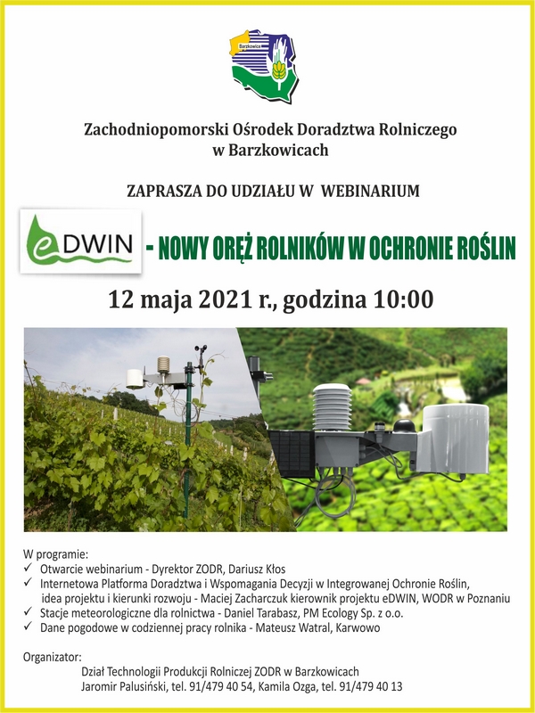 Pełna nazwa projektu to „Internetowa Platforma Doradztwa i Wspomagania Decyzji w Integrowanej Ochronie Roślin” jej celem jest stworzenie krajowego systemu informatycznego na rzecz ochrony roślin, co ma pozytywnie wpłynąć na jakość produkowanej w Polsce żywności. W praktyce będzie to oprogramowanie poświęcone ochronie roślin. Aby była ona trafna i skuteczna, musi być oparta na wiedzy i twardych danych. eDWIN będzie wspomagał rolników w podejmowaniu decyzji dotyczących ochrony roślin. Webinarium rozpocznie się w środę 12 maja o godz. 10:00 . By wziąć udział w szkoleniu należy zalogować się klikając w poniższy link: https://zodr.clickmeeting.com/-j-p-edwin-nowy-orez-rolnikow-w-ochronie-roslin Dostępny jest również kontakt do organizatorów szkolenia: Jaromir Palusiński – Dział Technologii Produkcji Rolniczej, tel. 91 479 40 54, Kamila Ozga - Dział Technologii Produkcji Rolniczej, tel. 91 479 40 13, e-mail: szkolenia.barzkowice@home.pl