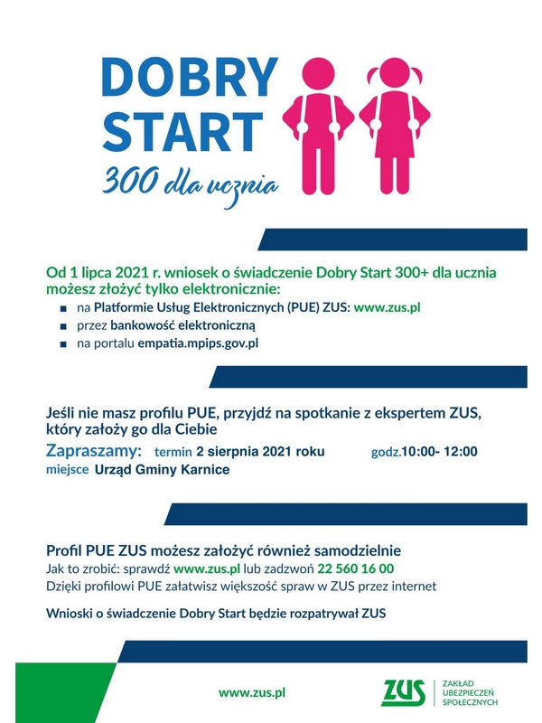 Od 1 lipca 2021 roku wniosek o świadczenie „Dobry Start” czyli 300 zł na ucznia można złożyć wyłącznie elektronicznie za pomocą Platformy Usług Elektronicznych ZUS, przez bankowość elektroniczną i na portalu empatia.mpips.gov.pl. By to zrobić trzeba posiadać profil na PUE ZUS. Potrzebny profil można założyć samodzielnie na stronie www.zus.pl lub dzwoniąc pod nr 22 560 16 00. Dla osób, które nie potrafią złożyć samodzielnie wniosku lub założyć profilu 2 sierpnia 2021 roku w godz. 10:00-12:00 w Urzędzie Gminy Karnice odbędzie dyżur eksperta ZUS. Pomoże on założyć potrzebny profil oraz złożyć wniosek o świadczenie „Dobry Start”. Rodzice, którzy chcą skorzystać z pomocy, muszą posiadać przy sobie: