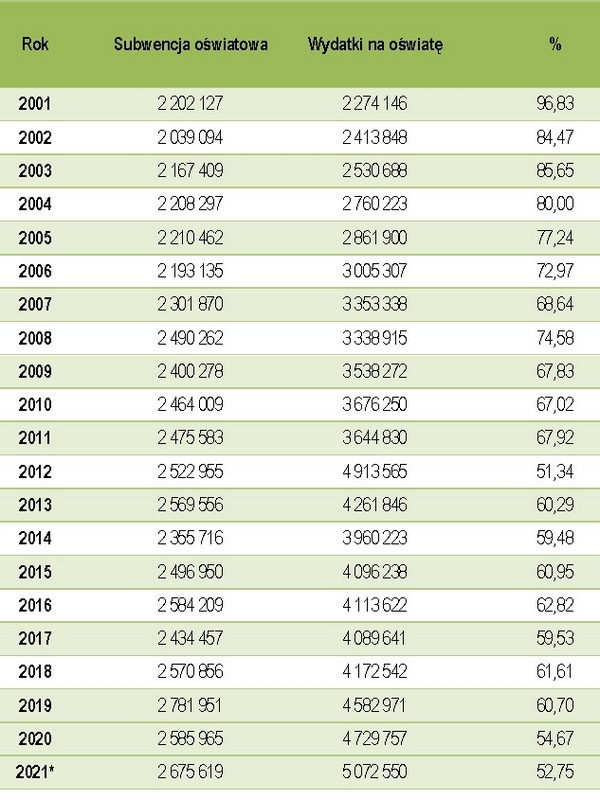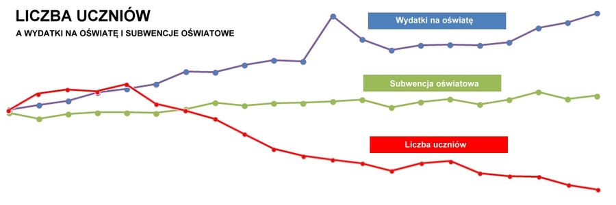 W ciągu 20 lat liczba uczniów zmniejszyła się o połowę, a wydatki na oświatę wzrosły ponad dwukrotnie. Otrzymywana z budżetu państwa subwencja w 2001 roku pokrywała 96,83 % wydatków na oświatę, a w 2020 już tylko 54,67 %.