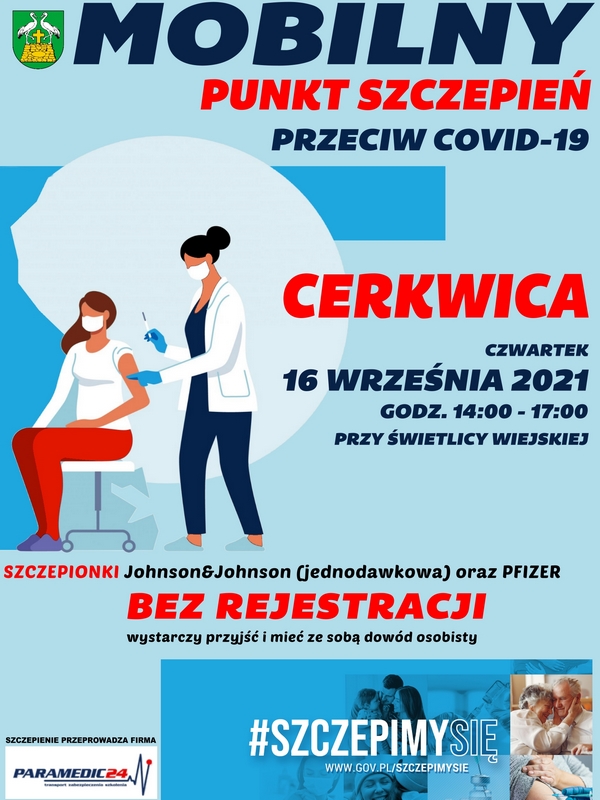Już w najbliższy czwartek 16 września będzie możliwość skorzystania ze szczepień przeciw Covid-19 w mobilnym punkcie szczepień przy świetlicy wiejskiej w Cerkwicy. Szczepienia będą wykonywane preparatami firmy PFIZER oraz Johnson&Johnson.