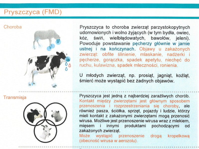 Pryszczyca (FMD) jest zakaźną i zaraźliwą chorobą zwierząt parzystokopytnych domowych oraz dzikich. Na zakażenie najbardziej wrażliwe jest bydło, następnie świnie, owce i kozy. Wirus może być przenoszony także przez człowieka, sprzęt gospodarski, ptaki, owady, gryzonie, środki transportu czy odzież.
