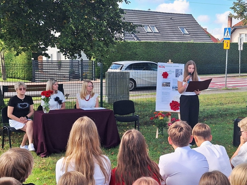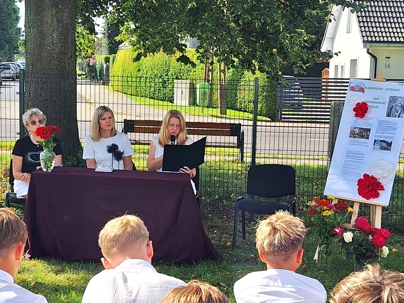 W malowniczej scenerii przed budynkiem karnickiej szkoły odbyło się Narodowe Czytanie poezji Jana Kochanowskiego. Spotkanie zgromadziło uczniów oraz nauczycieli, którzy wspólnie wsłuchiwali się w ponadczasowe utwory jednego z najwybitniejszych polskich twórców. W atmosferze pełnej refleksji lektorzy wydarzenia, którymi byli: Dyrektor Zespołu Szkół Publicznych w Karnicach Monika Kocik, Dyrektor Gminnej Biblioteki Publicznej w Karnicach Anna Majkoś, pracownik GBP Ewa Trębicka, a także uczniowie klas VII i VIII przypomnieli najpiękniejsze fraszki, pieśni i treny. Słowa Jana Kochanowskiego wybrzmiewające tego dnia uświadomiły uczestnikom, że jego twórczość pozostaje niezwykle aktualna, skłaniając do zadumy nad ludzką naturą, przemijaniem oraz wartościami nadającymi sens życiu. Było to piękne i inspirujące doświadczenie, które pokazało, że wspólne obcowanie z literaturą może być źródłem radości.