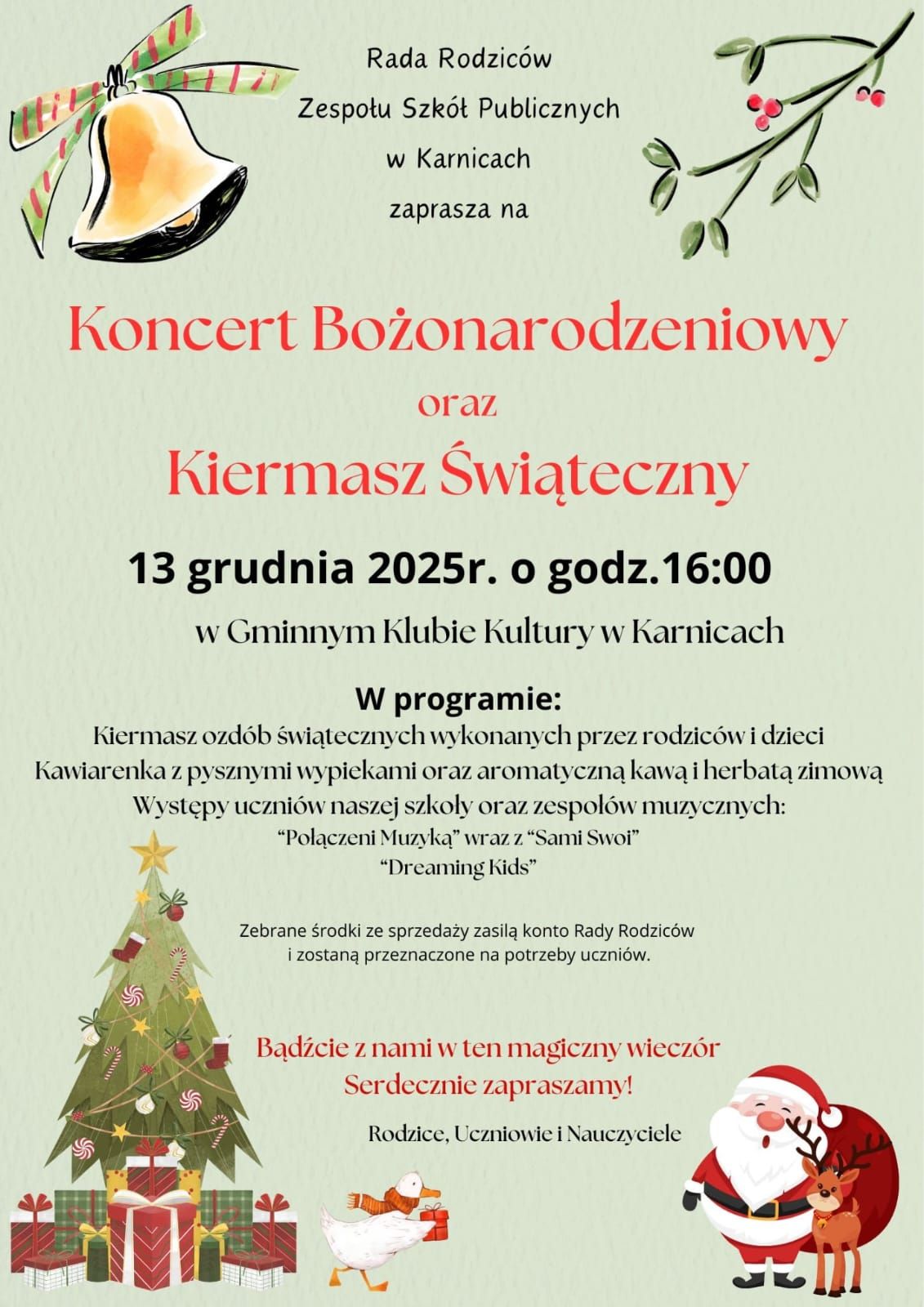 W imieniu Rady Rodziców Zespołu Szkół Publicznych w Karnicach serdecznie zapraszamy Państwa na Koncert Bożonarodzeniowy połączony z Kiermaszem Świątecznym, który odbędzie się w sobotę, 13 grudnia 2025 r., o godzinie 16:00 w Gminnym Klubie Kultury w Karnicach.
