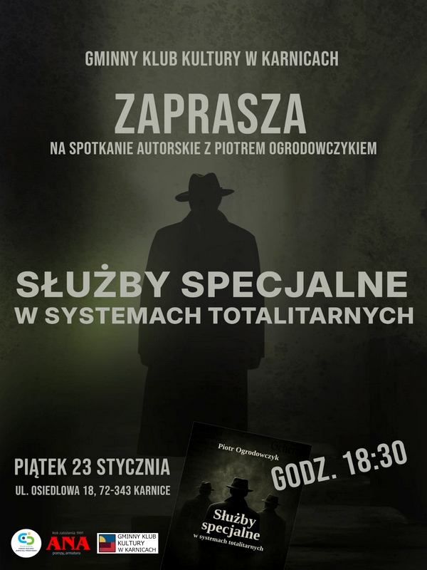 Gminny Klub Kultury w Karnicach zaprasza na spotkanie autorskie z Piotrem Ogrodowczykiem – politologiem i badaczem dziejów systemów totalitarnych, autorem książki „Służby specjalne w systemach totalitarnych”. Podczas spotkania autor opowie o kulisach działania tajnych służb w XX wieku – w ZSRR, III Rzeszy, NRD oraz w Polsce Ludowej – o mechanizmach strachu, inwigilacji i propagandy, a także o tym, jak aparat represji wpływał na codzienne życie zwykłych ludzi. To opowieść oparta na solidnych badaniach archiwalnych, ale prowadzona w przystępny i angażujący sposób. Książka Piotra Ogrodowczyka odsłania nie tylko fakty i daty, lecz także dramaty ofiar i sprawców, pokazując, jak krucha bywa wolność i jak łatwo można ją utracić. Spotkanie będzie okazją do rozmowy o historii, która pozostaje bolesną, ale ważną przestrogą dla współczesności.