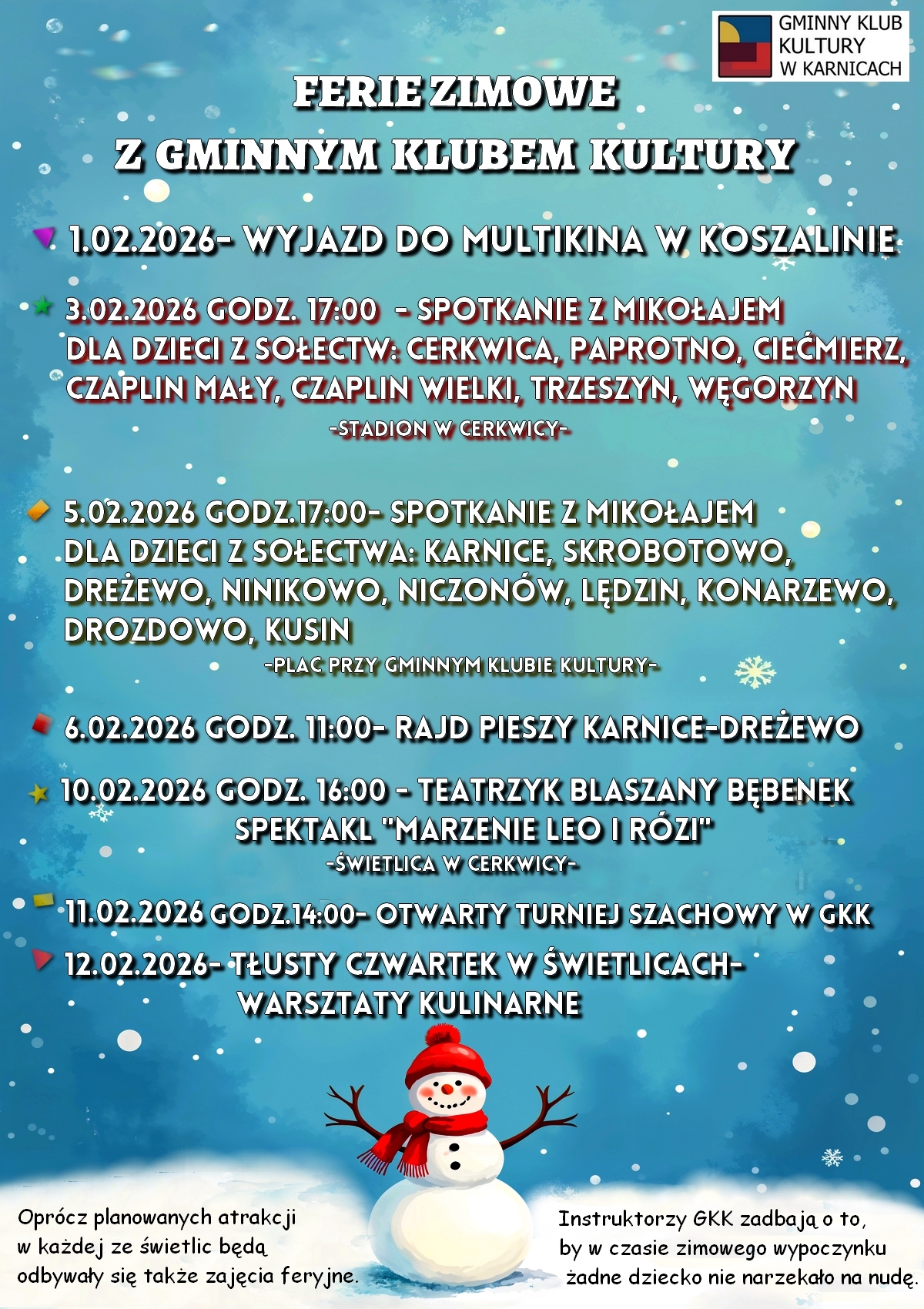 Wielkimi krokami zbliżają się ferie zimowe, a wraz z nimi czas odpoczynku, zabawy i niezapomnianych wrażeń. Z myślą o dzieciach i młodzieży Gminny Klub Kultury przygotował w tym roku wyjątkowo bogaty i zróżnicowany program atrakcji, wśród których znajduje się m.in. wyjazd do kina oraz liczne spotkania i warsztaty.