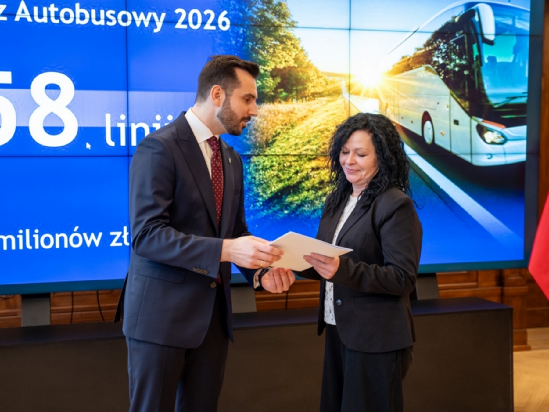 28 stycznia br. w Zachodniopomorskim Urzędzie Wojewódzkim w Szczecinie odbyło się uroczyste przekazanie umów dotyczących dofinansowania lokalnych połączeń autobusowych na lata 2026–2028. Wicewojewoda Zachodniopomorski Bartosz Brożyński wręczył przedstawicielom samorządów dokumenty potwierdzające przyznanie środków z Funduszu Rozwoju Przewozów Autobusowych. W gronie gmin, które otrzymały wsparcie, znalazła się również Gmina Karnice, jako jedna z trzech gmin powiatu gryfickiego objętych dofinansowaniem. Umowę w imieniu samorządu podczas oficjalnej ceremonii odebrała Zastępca Wójta Gminy Karnice, Eliza Koclejda.