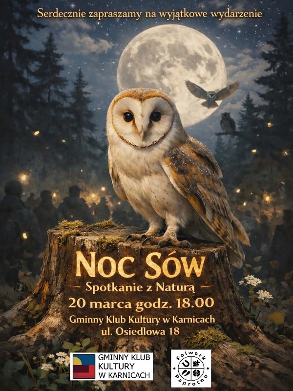 Jest to doskonała propozycja dla wszystkich miłośników przyrody. Serdecznie zapraszamy na Noc Sów w piątek 20 marca 2026 r. o godz. 18:00 do Gminnego Klubu Kultury w Karnicach.