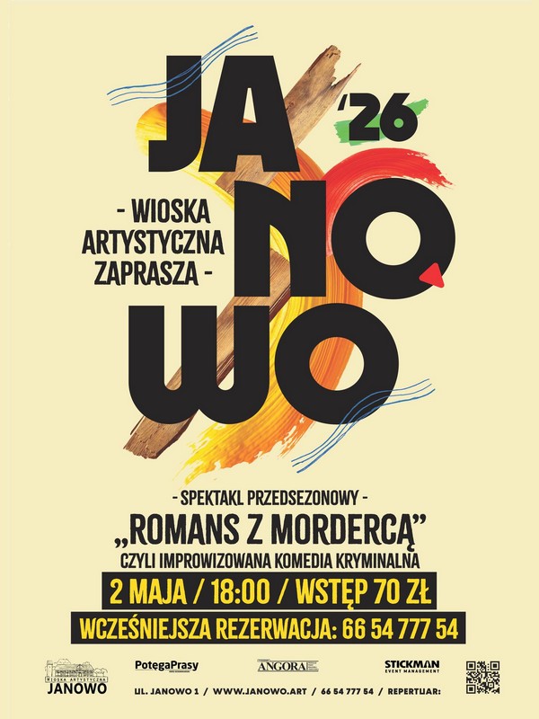 Wioska Artystyczna Janowo zaprasza na wyjątkowy wieczór, który rozgrzeje publiczność jeszcze przed startem 9. sezonu artystycznego. Już 2 maja o godz. 18:00 miłośnicy teatru, dobrego humoru i nieoczekiwanych zwrotów akcji będą mogli obejrzeć komedię improwizowaną pt. „Romans z mordercą” w wykonaniu Sceny IMPRO Teatru Nowego w Łodzi. Miłość i zbrodnia – duet nie do końca klasyczny. W tej czarnej komedii to Państwo wybiorą, kto jest ofiarą, kto kochankiem, a kto wszystko udaje. Po drodze mogą pojawić się ukryte motywy, tajemnicze listy i podejrzane pocałunki. Będzie zabawnie, inspirująco i.. może trochę groźnie. Jesteśmy przekonani, że spektakl oraz niepowtarzalny klimat Wioski Artystycznej Janowo dostarczą Państwu wspaniałych wrażeń i relaksu.