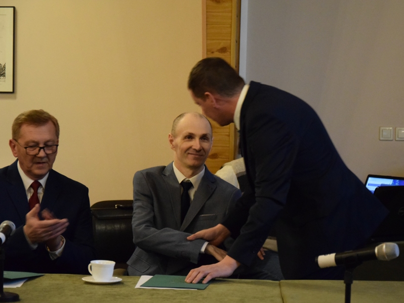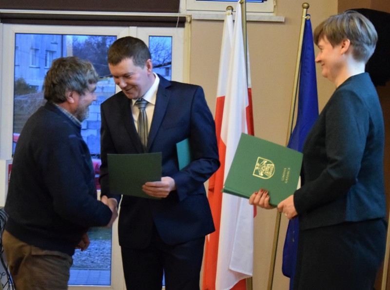 foto:Przewodniczący Gminnej Komisji Wyborczej Piotr Strojek wręcza zaświadczenie o wyborze radnemu Dariuszowi Smalowi
